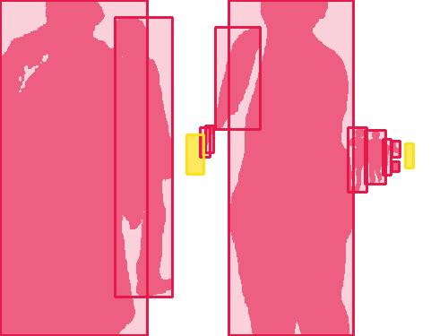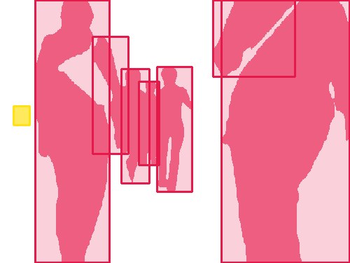 Segmentations vs. Bounding Boxes. When objects pass each other, large parts of an object’s bounding box may belong to another instance, while per-pixel segmentation masks locate objects precisely. The shown annotations are crops from the KITTI MOTS dataset.